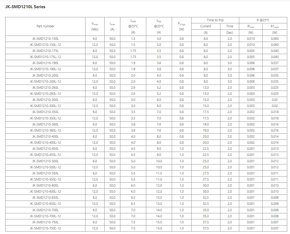 首页 产品展示 自恢复保险丝 SMD1210L Series系列自复保险丝